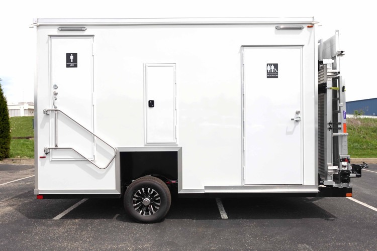 Station Layout: One women's restroom, one men's restroom with urinal, and one ADA-compliant unisex restroom — three stations total. The men's and women's stations are accessed via stairs on one end of the trailer. The ADA station has its own separate entrance with an integrated aluminum ramp and platform on the opposite end, providing independent wheelchair access.