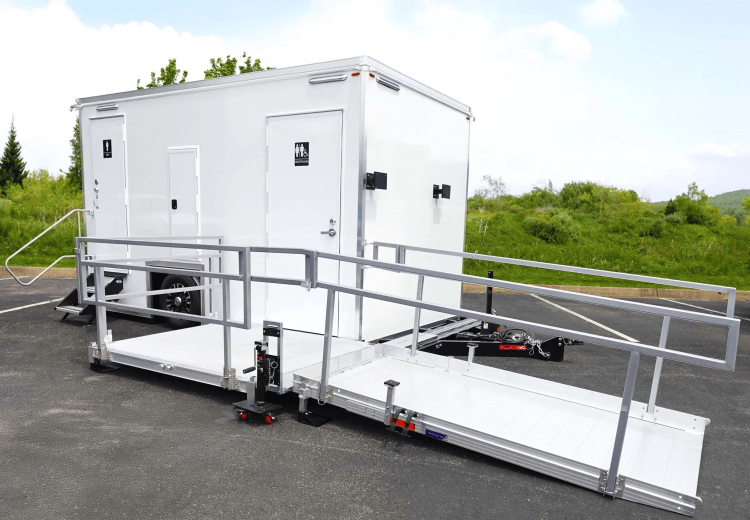| ADA-Compliant Unisex Restroom Spacious wheelchair-accessible station with grab bars, a full-size ADA toilet, and wall-mounted sink. The trailer lowers to the ground using hydraulics, and an integrated 4' × 8' aluminum ramp with a 5' × 6' platform provides step-free access. |